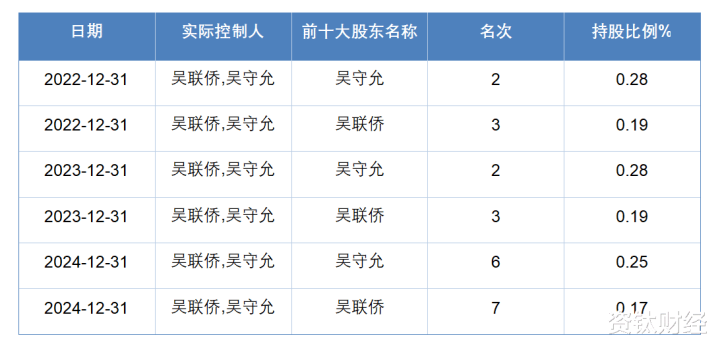 从表面看,两位实际控制人的直接持股比例并不高,2022年至2024年还出现了微降——吴守允从0.2839%降至0.2512%,吴联侨从0.1893%降至0.1675%。但通过“控股平台+一致行动人”的架构,其控制权反而更加集中稳定,能够直接主导董事会人选、重大投资决策及经营战略方向,公司内部几乎缺乏有效的制衡机制。
